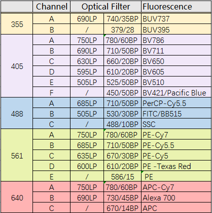 仪器简介:BD LSRFortessa同时配置多达5根激光器——蓝色,黄绿色,红色,紫色和紫外激光,在使用新的荧光染料时可以灵活地优化激发波长。该仪器的独特光路设计可同时进行多达20个参数检测,从而全面满足当前和未来检测要求。该仪器能够快速精确的分析各种类型的细胞,包括淋巴组织细胞、消化组织细胞以及血细胞等。可进行细胞膜受体检测,细胞内和细胞外抗原的检测,细胞凋亡和坏死的检测等。具体的激光器和对应的荧光通道配置如下: