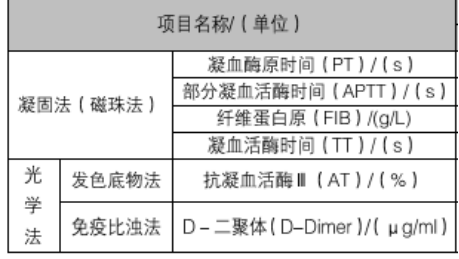 SF-8050 采用凝固法(磁珠法)、光学法(发色底物法、免疫比浊法),对血浆进行凝血、抗凝血、纤溶和抗纤功能进行测试。检测指标:PT、APTT、TT、FIB、D-二聚体。