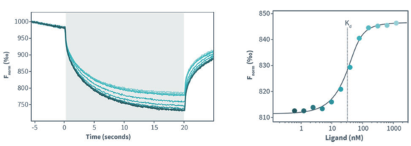 Monolith X分子互作仪基于光谱位移(Spectral Shift, SpS)技术和微量热泳动(MicroScale Thermophoresis, MST) 精确定量表征分子间亲和力Kd值,具有操作简便、无需固定、可溶液内直接检测、快速和样品消耗量少等优势。在进行实验时对靶标分子进行荧光标记,然后将其与配体分子混合,配体结合会改变荧光基团的化学微环境,从而引起发射光谱的蓝移或红移,又或是发射峰变宽,以配体浓度为横坐标,荧光值为纵坐标作图,可拟合得到Kd值。Monolith分子互作仪可以测定蛋白、多肽、核酸、离子、纳米颗粒、病毒等几乎所有类型的分子间亲和力,广泛应用于药物筛选、结构生物学、生物化学等研究领域。