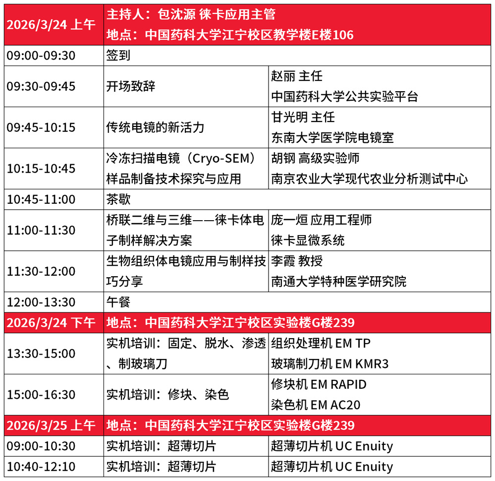 为促进生物电镜制样技术交流与推广,解决生命科学研究中样品制备实际难题,提升电镜成像质量与科研水平,中国药科大学公共实验平台联合徕卡显微系统(上海)贸易有限公司、南京顺凌科技有限公司,定于2026 年 3 月24日至25日在中国药科大学江宁校区举办江苏省生物电镜样品制备技术专题培训班。现将具体安排通知如下: